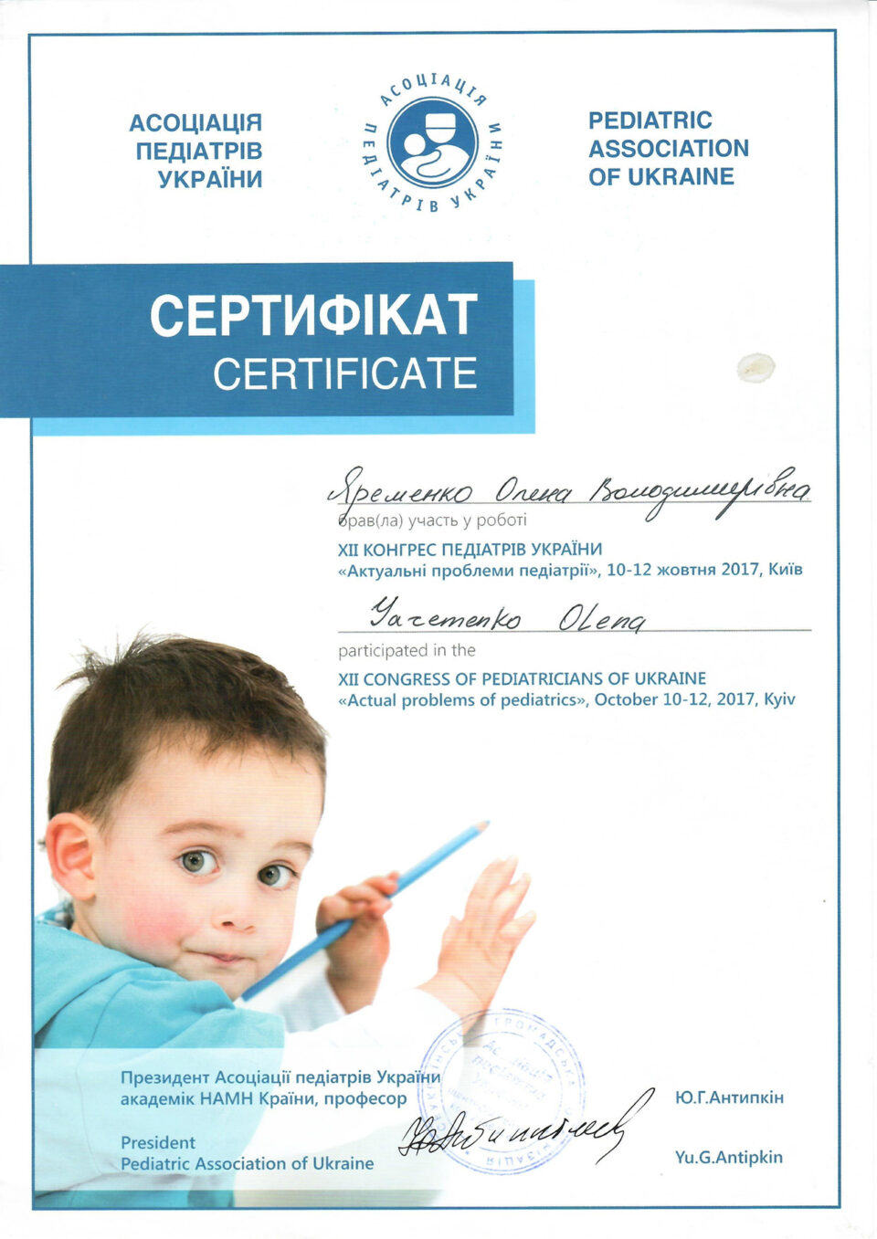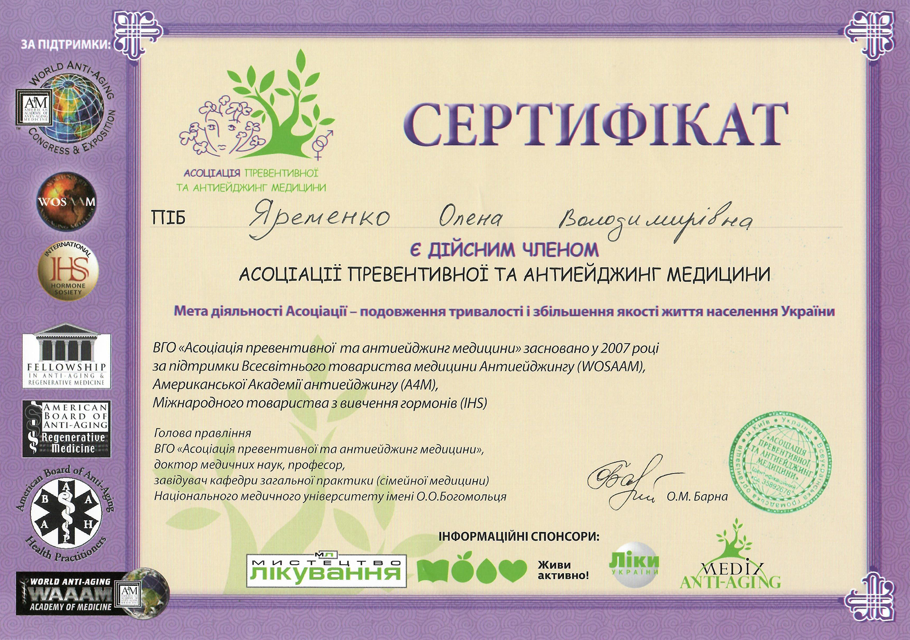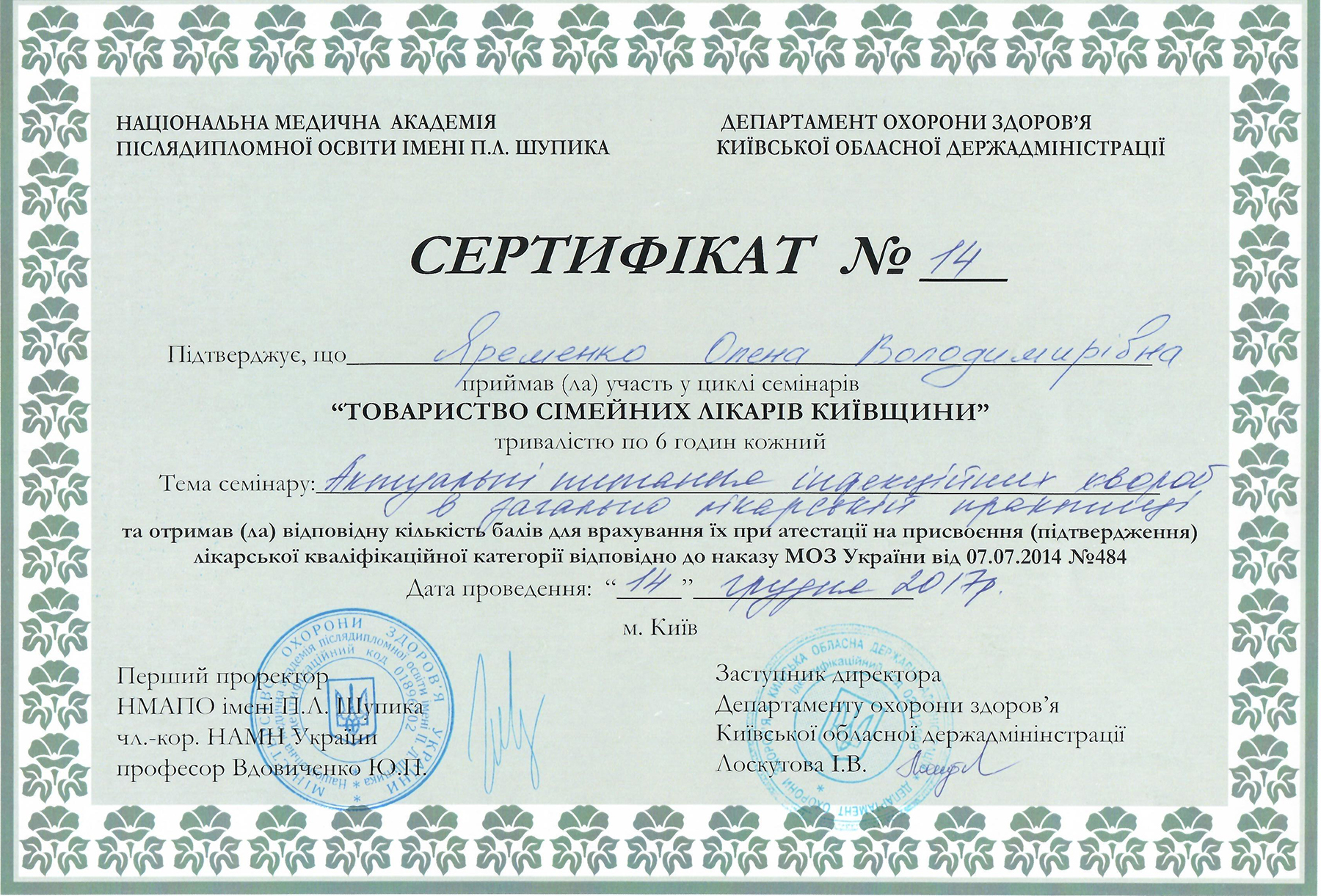Постоянно повышает свой квалификационный уровень путем участия в практических курсах тематического усовершенствования, научно-практических конференциях, семинарах, посвященных вопросам семейной медицины.